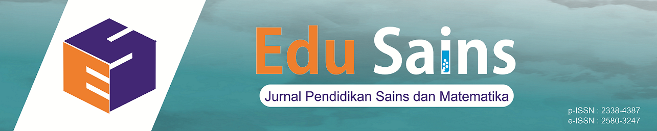 Edu Sains: Jurnal Pendidikan Sains dan Matematika (p-ISSN 2338-4387; e-ISSN 2580-3247) is an open-access, peer-reviewed journal published biannually in June and December. The journal is published by the Institut Agama Islam Negeri (IAIN) Palangka Raya, Indonesia.